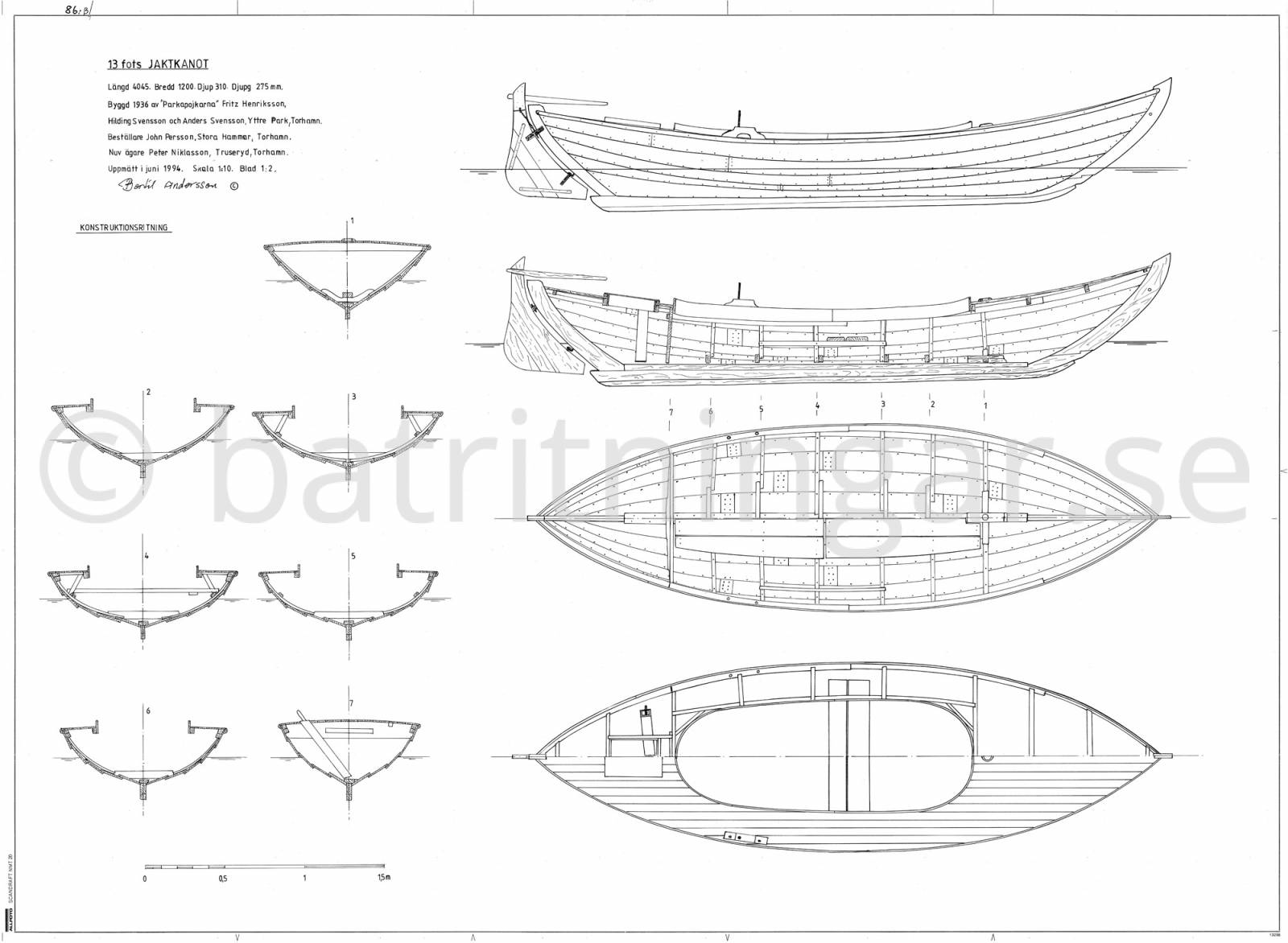 The measuring is done from existing boats that are traditionally built. Some are still in use, some are stored in different museums and some are left as wrecks in different places. Some of these wrecks have more or less fallen to pieces, but are reconstructed at the plan. Several boats are gone and does not exist any more.
