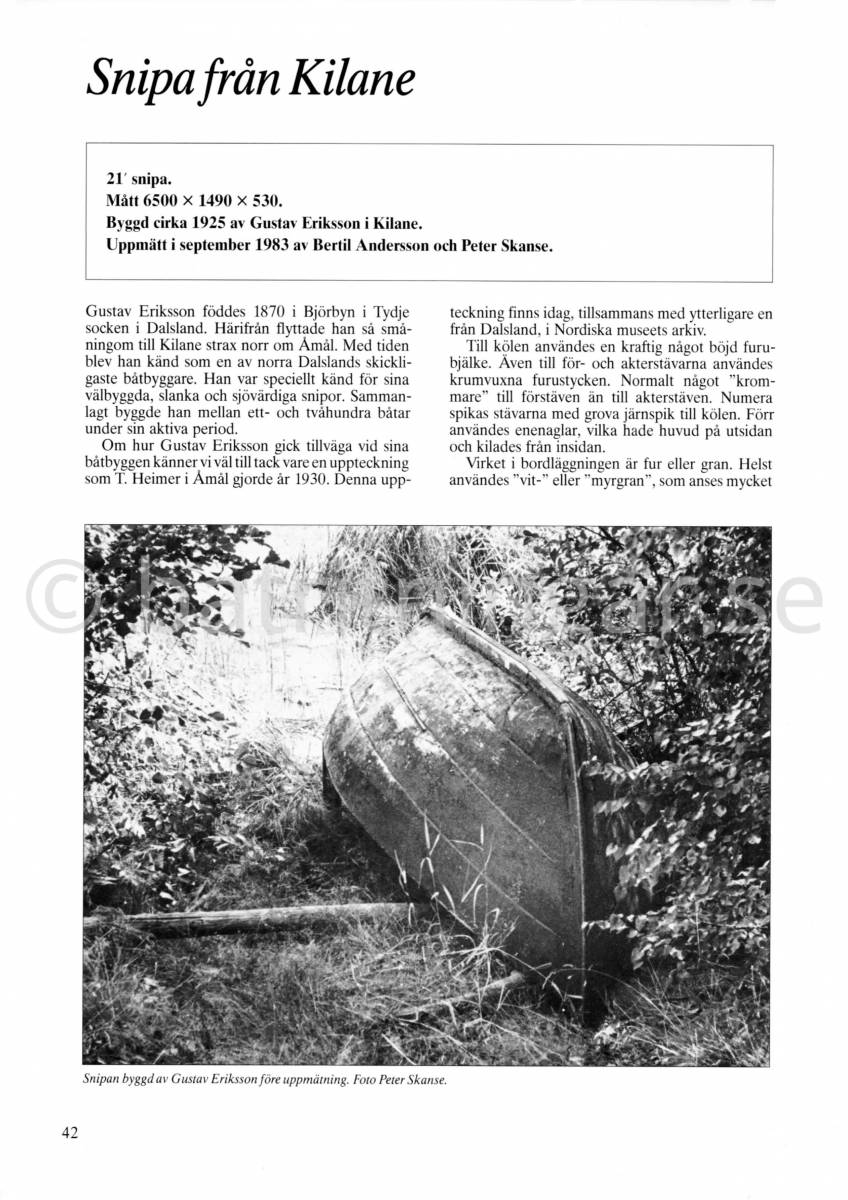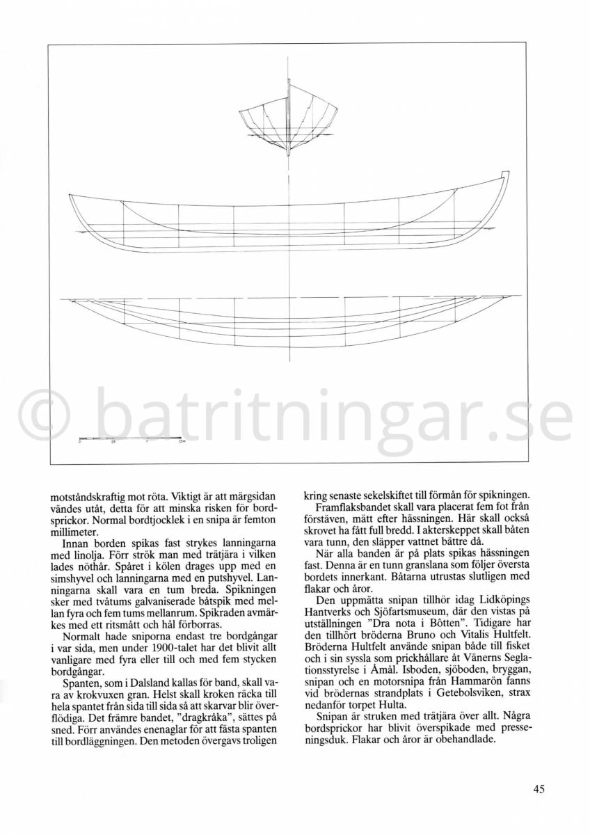 You often hear the name snipa on a boat, a name that is often mistaken on some boats. But the name is associated with the older open boats that were very slender in their lines and pointed in front and stern. These boats were light-rowed and really adapted for more protected water, but despite that we find many snipa used in the open sea. Like Ölandssnipan, Gotlandssnipan, Skånesnipan in southern Sweden. In the lakes we find Vänersnipan and Vättersnipan. The most "pointed" boats are found in Norway's fjords and coasts, such as Oselvern and the <>Nordland boat, extremely slim boathull for rowing and sailing.