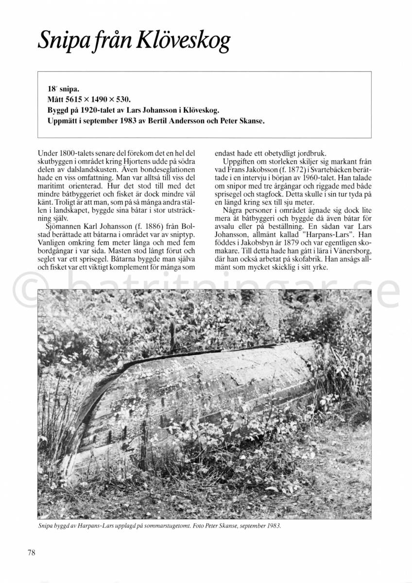 You often hear the name snipa on a boat, a name that is often mistaken on some boats. But the name is associated with the older open boats that were very slender in their lines and pointed in front and stern. These boats were light-rowed and really adapted for more protected water, but despite that we find many snipa used in the open sea. Like Ölandssnipan, Gotlandssnipan, Skånesnipan in southern Sweden. In the lakes we find Vänersnipan and Vättersnipan. The most "pointed" boats are found in Norway's fjords and coasts, such as Oselvern and the <>Nordland boat, extremely slim boathull for rowing and sailing.